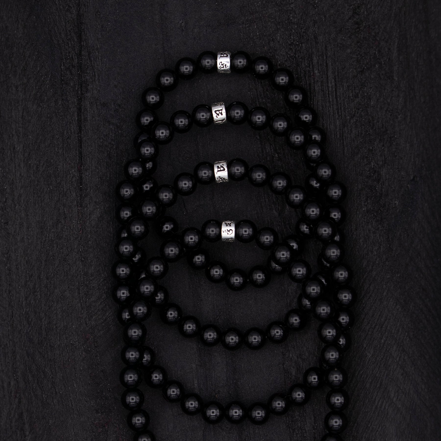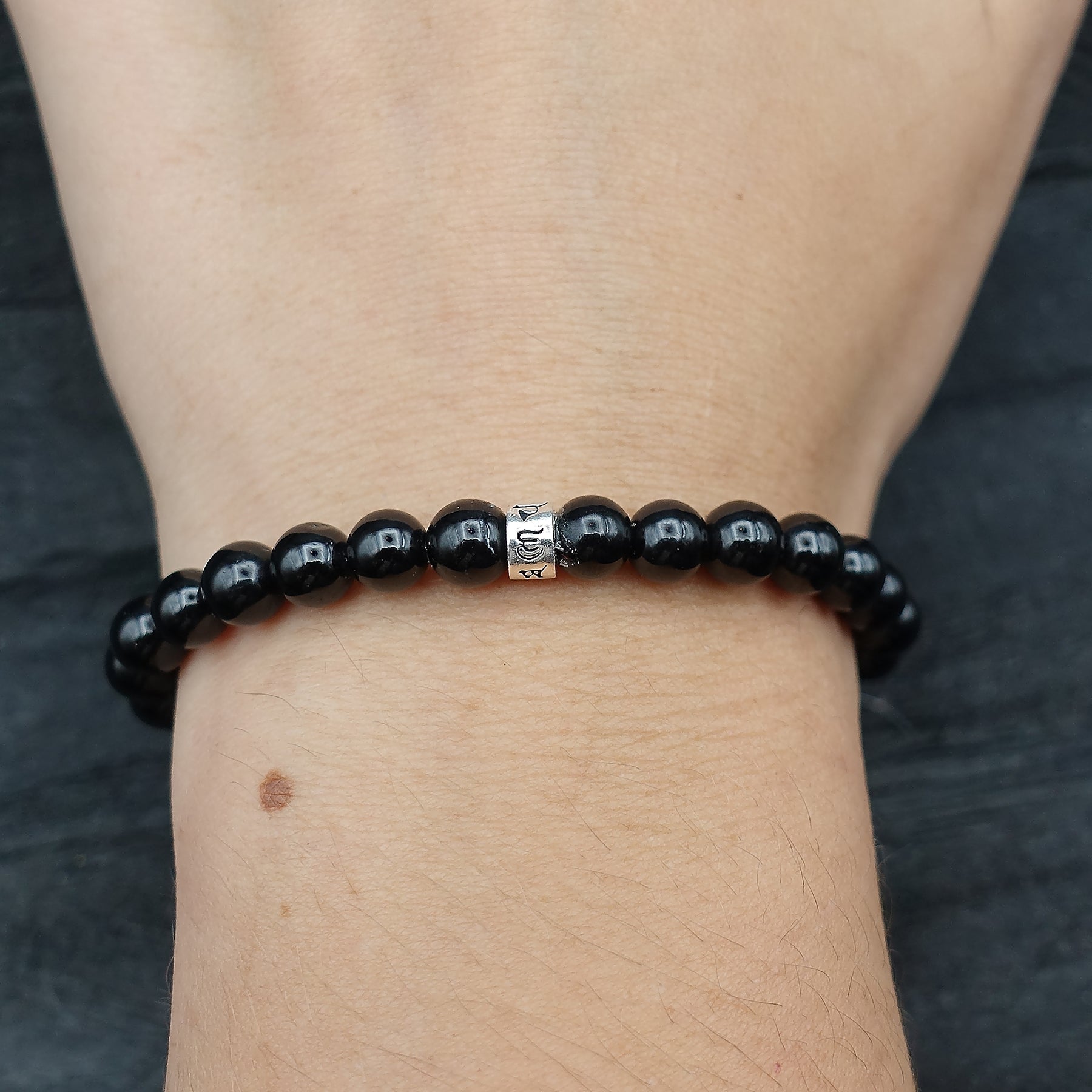 6mm AAA Grade Black Tourmaline gemstone beads with Sterling Silver Barrel Mantra bead on strong stretch cord.