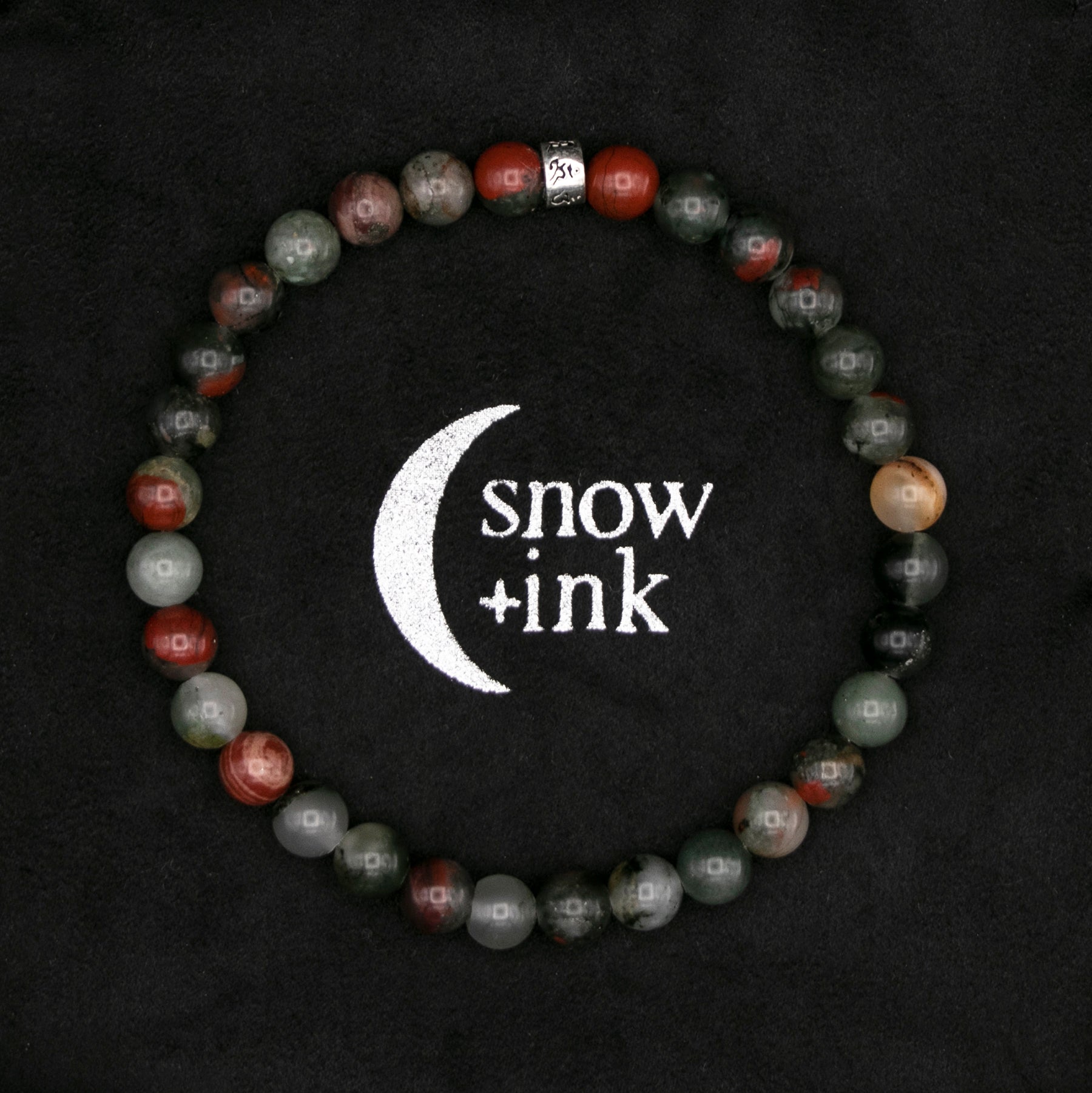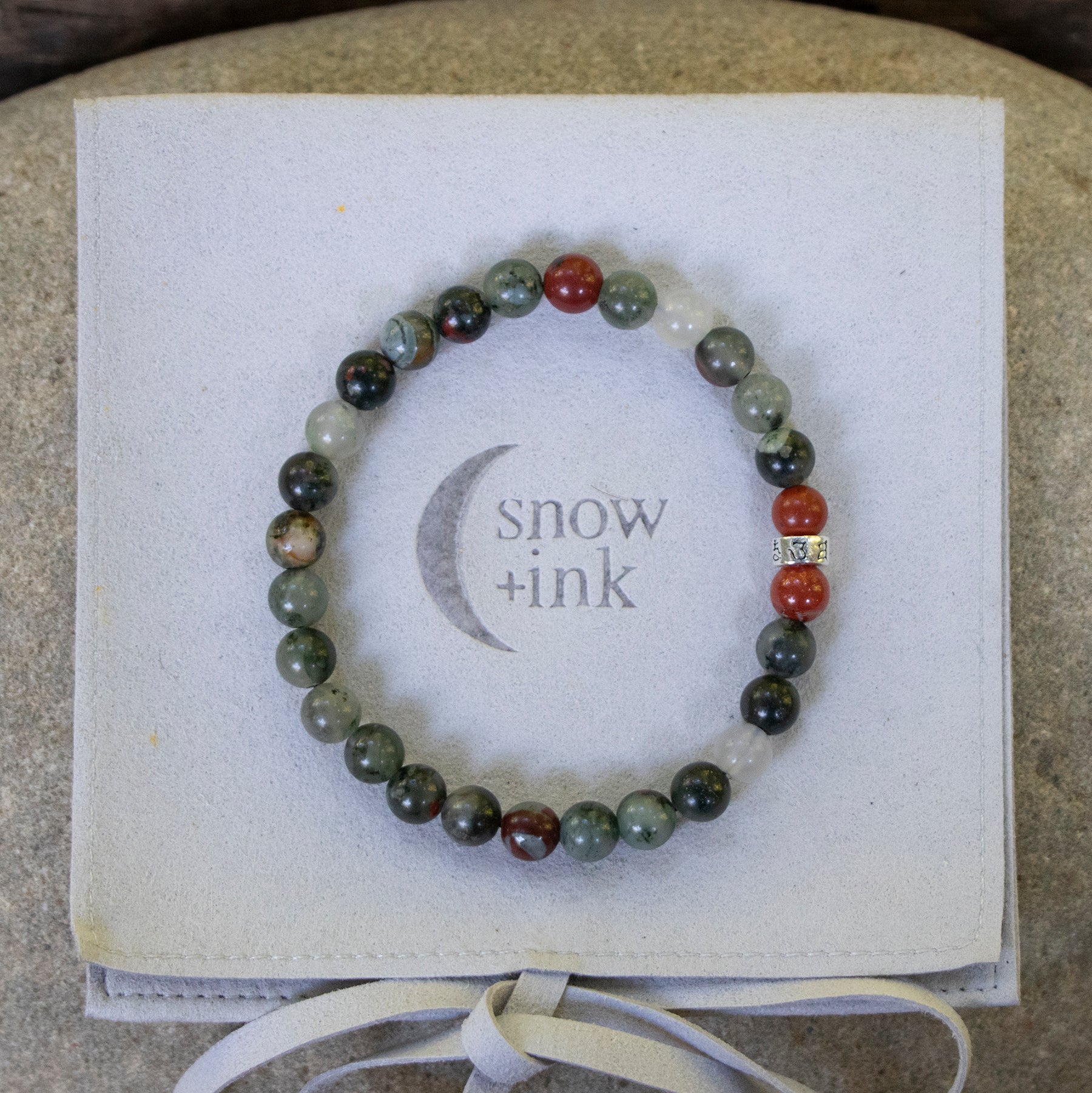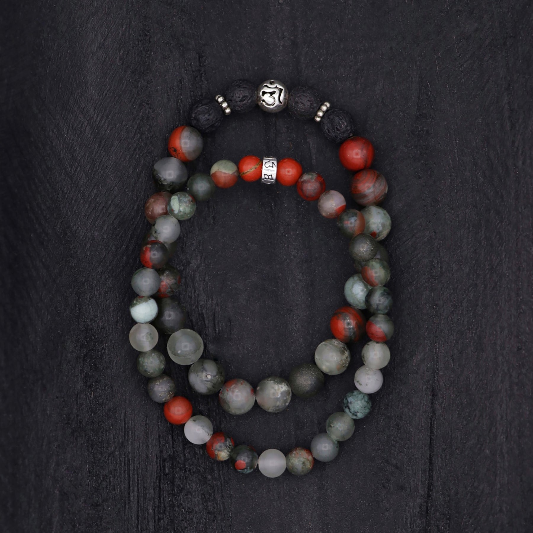 6mm AAA Grade Bloodstone gemstones beads, 6mm Red Jasper beads, Sterling Silver mantra bead on Strong elastic cord.