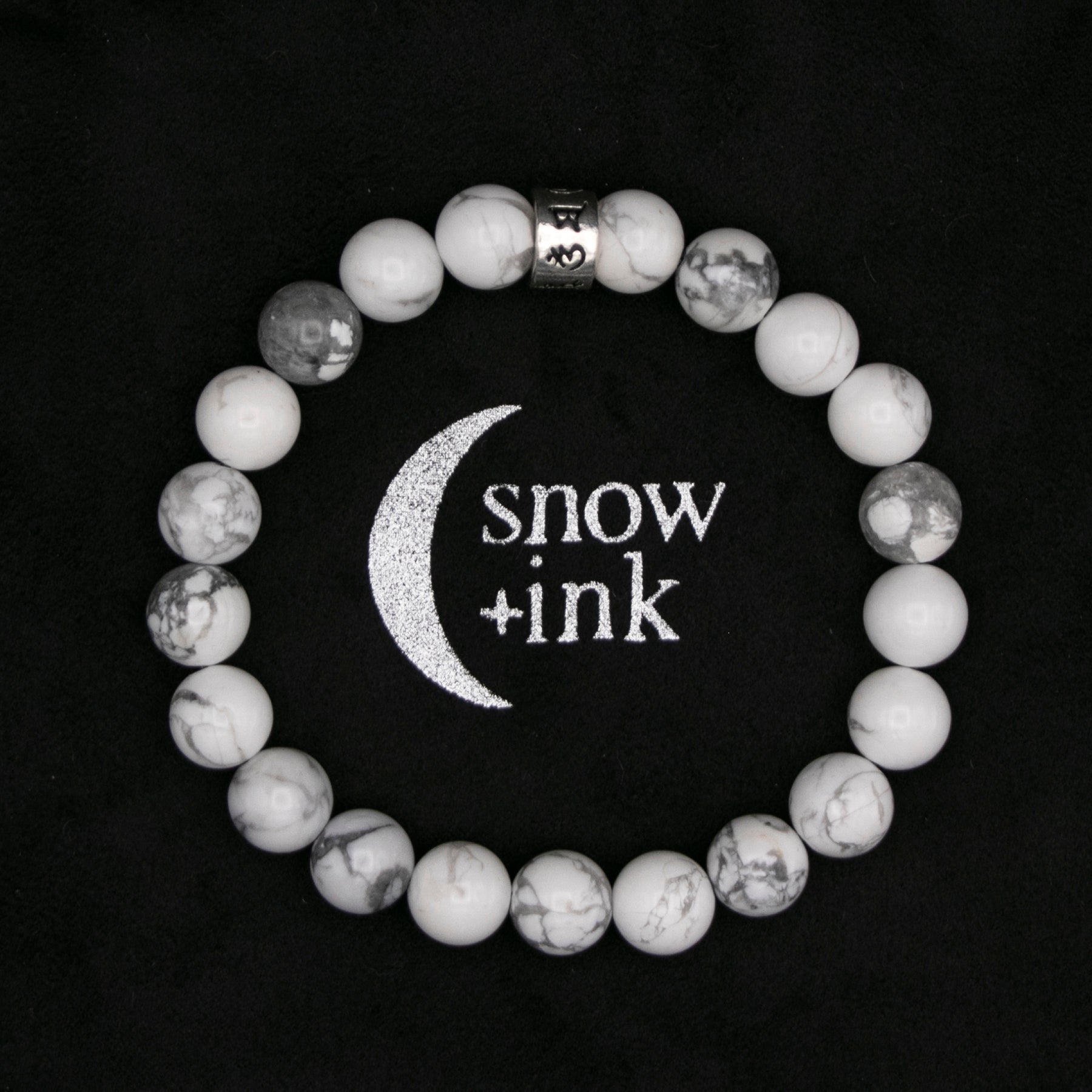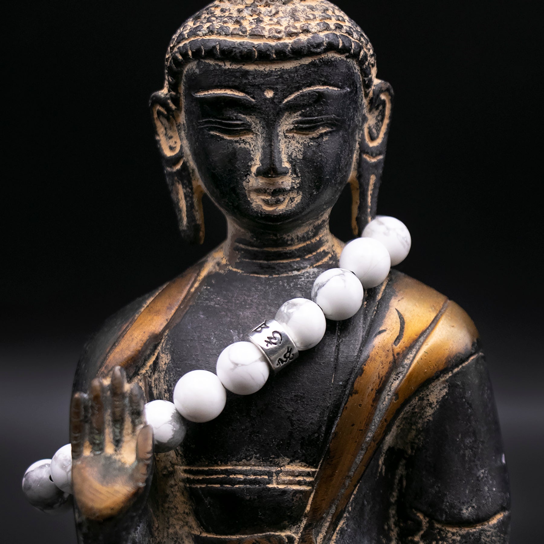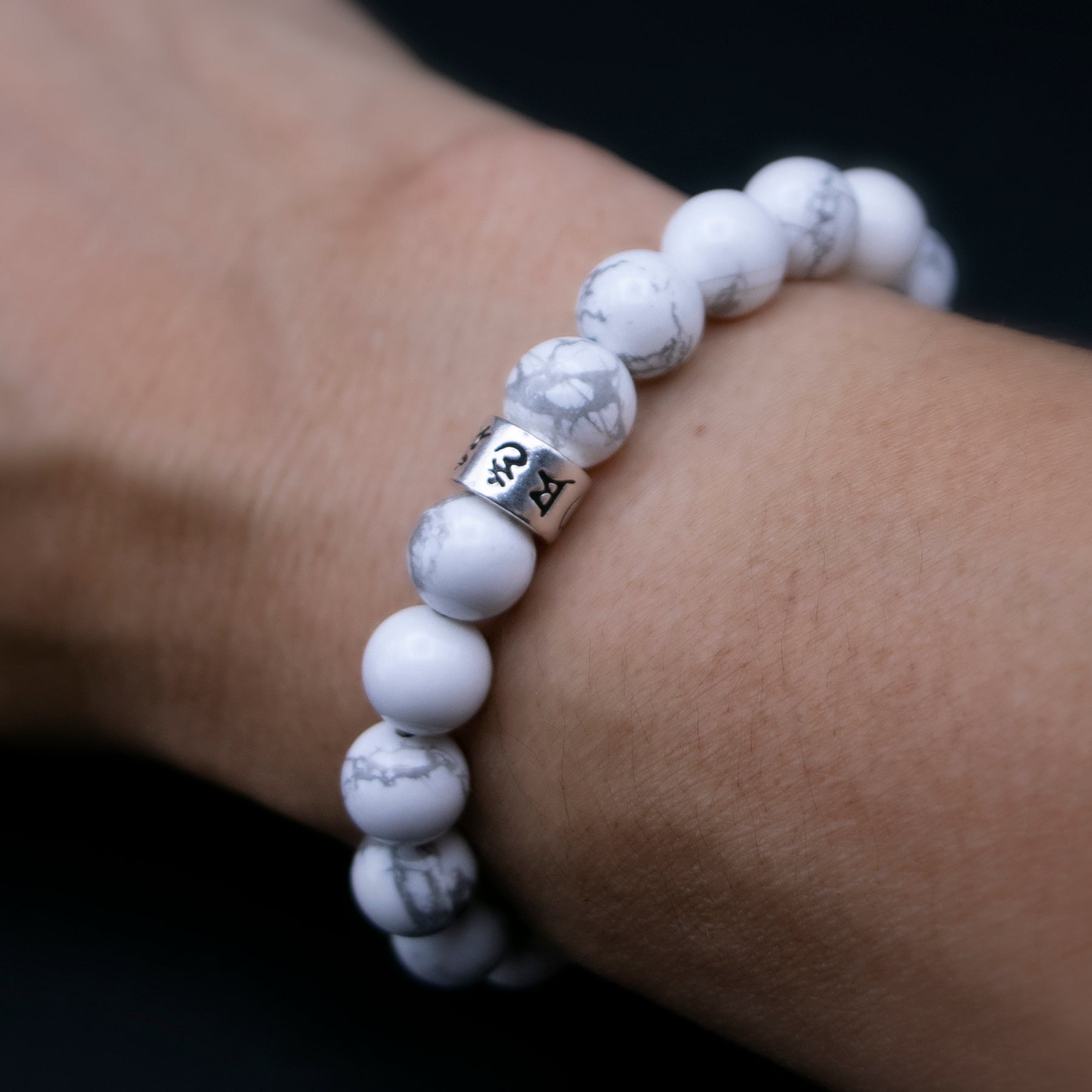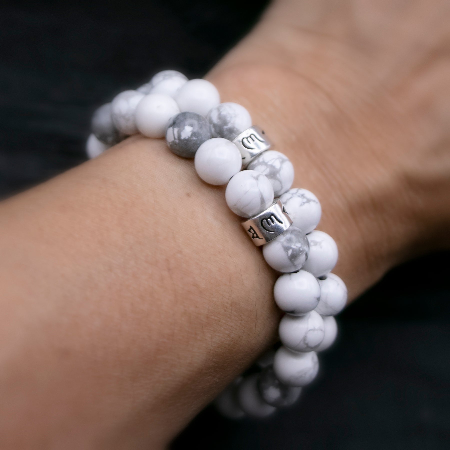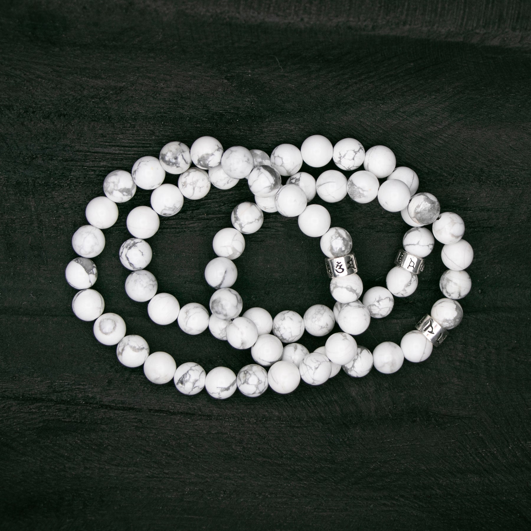 8mm Howlite Beads and one small Sterling Silver barrel mantra bead on a strong elastic cord.