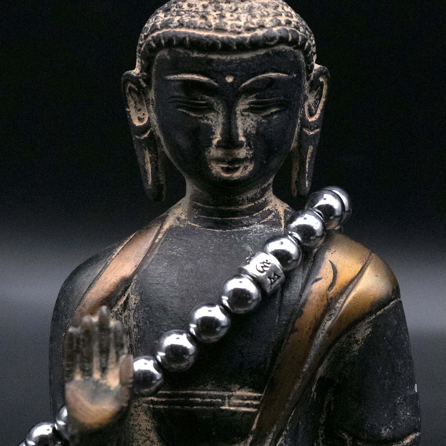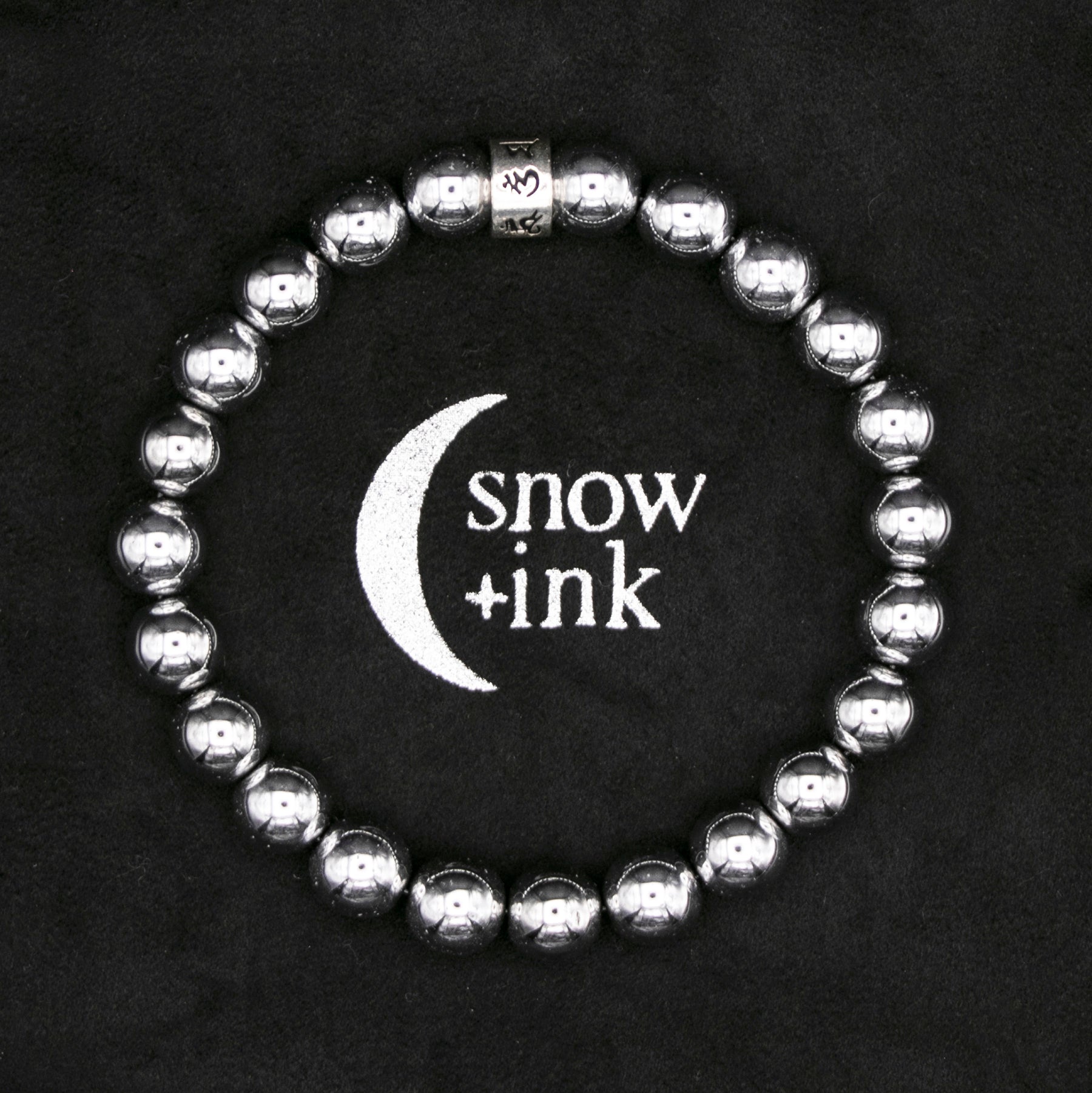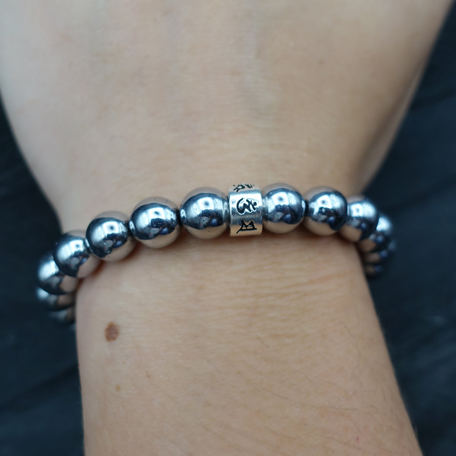 8mm AAA Grade Silver Hematite Beads and 1 Sterling Silver Barrel Mantra bead 8mm round Mantra bead on Strong elastic cord.