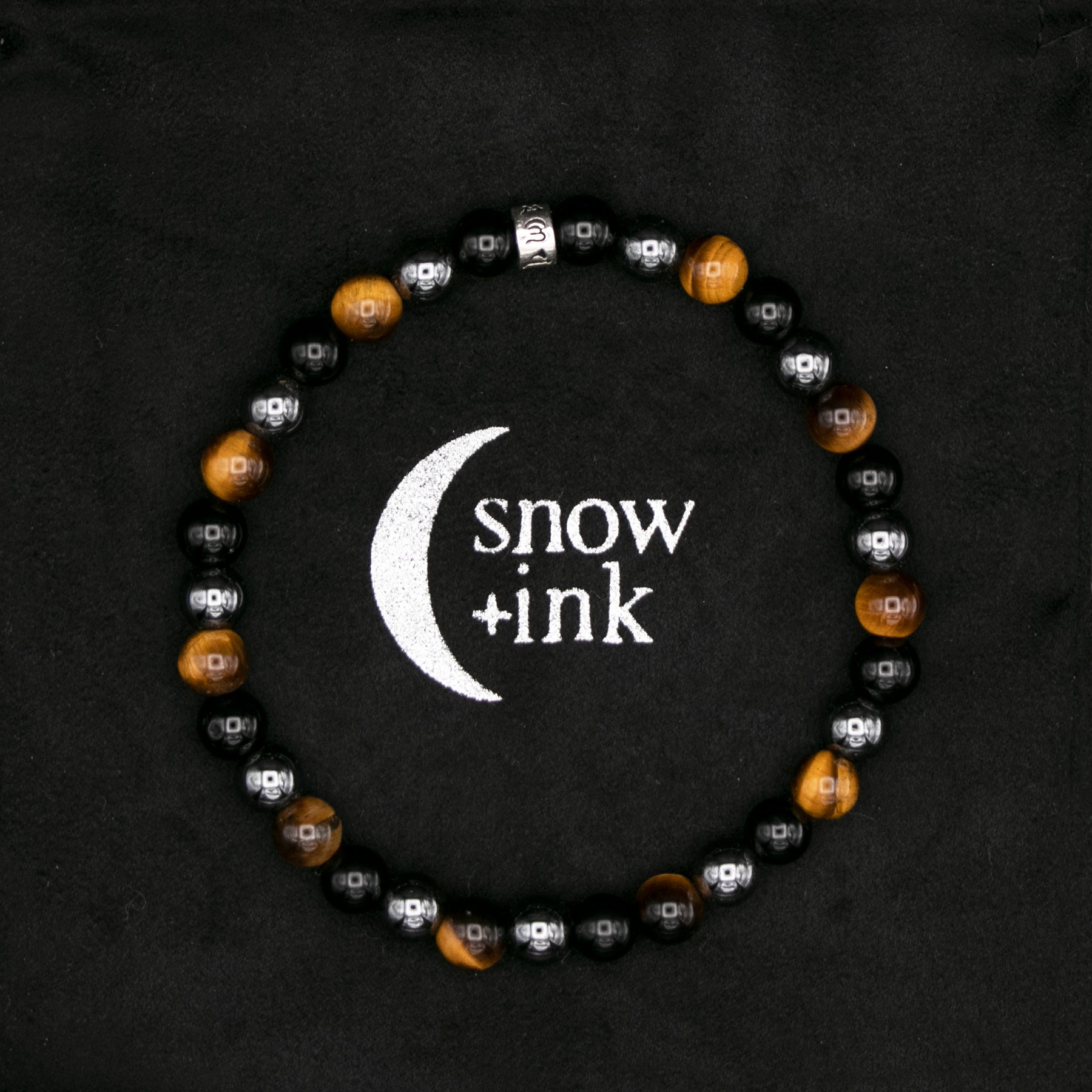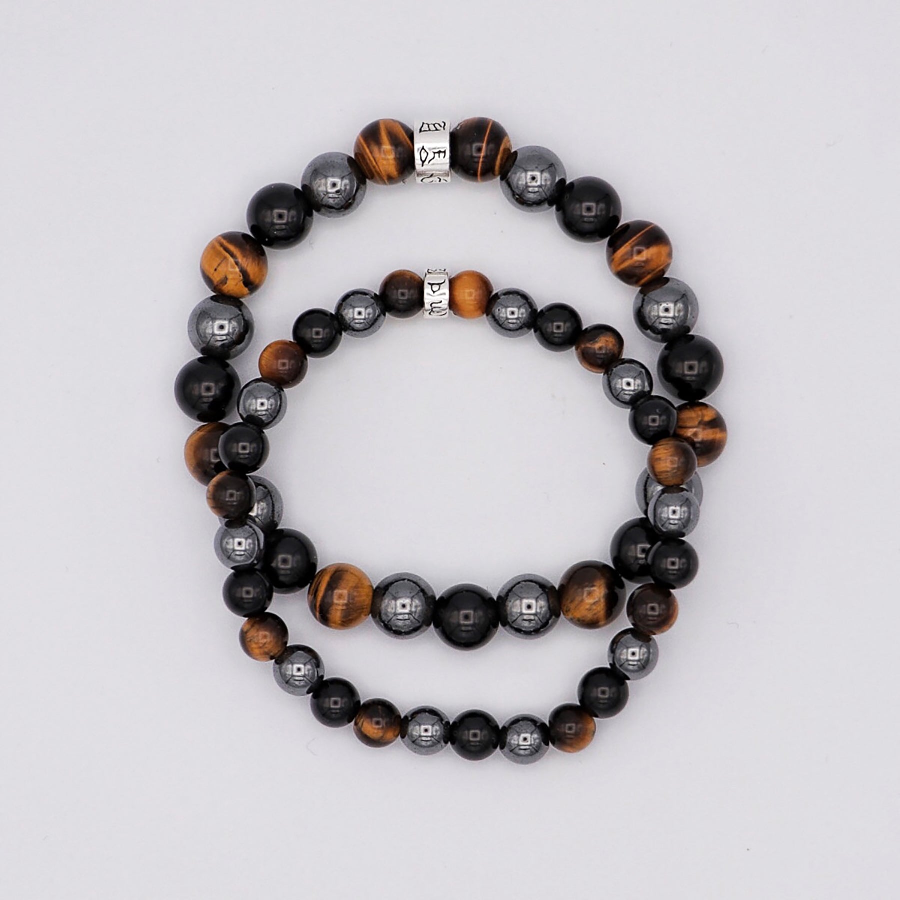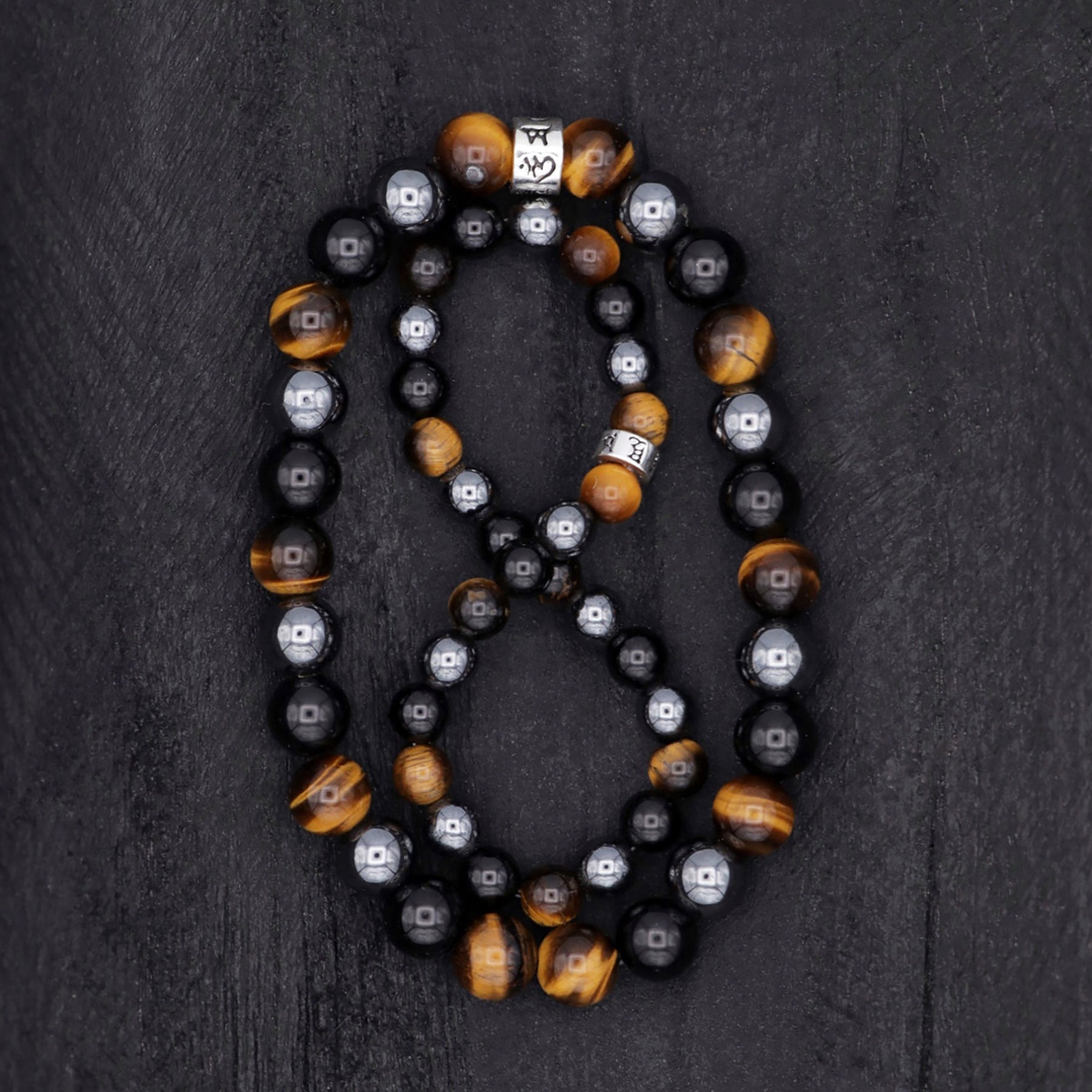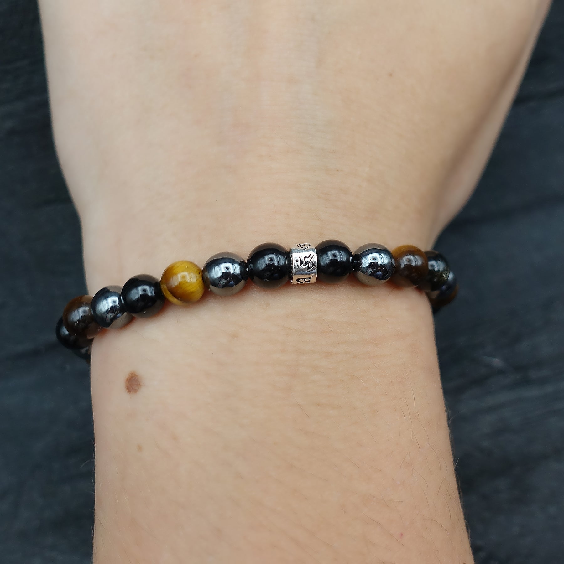 AAA Grade 6mm Black Tourmaline, Tiger's Eye and Hematite Gemstone beads with Sterling Silver Mantra Barrel Bead.